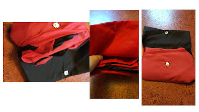 So first up: the umbrella bag. I am including instructions for how to make it. (Linking a pdf) The bag itself is about the size of a standard plastic grocery bag. This umbrella, as can be seen, was red and black, so it is easy to see where the seams are. I just use the umbrella pieced as it is; I don't worry about those seams
