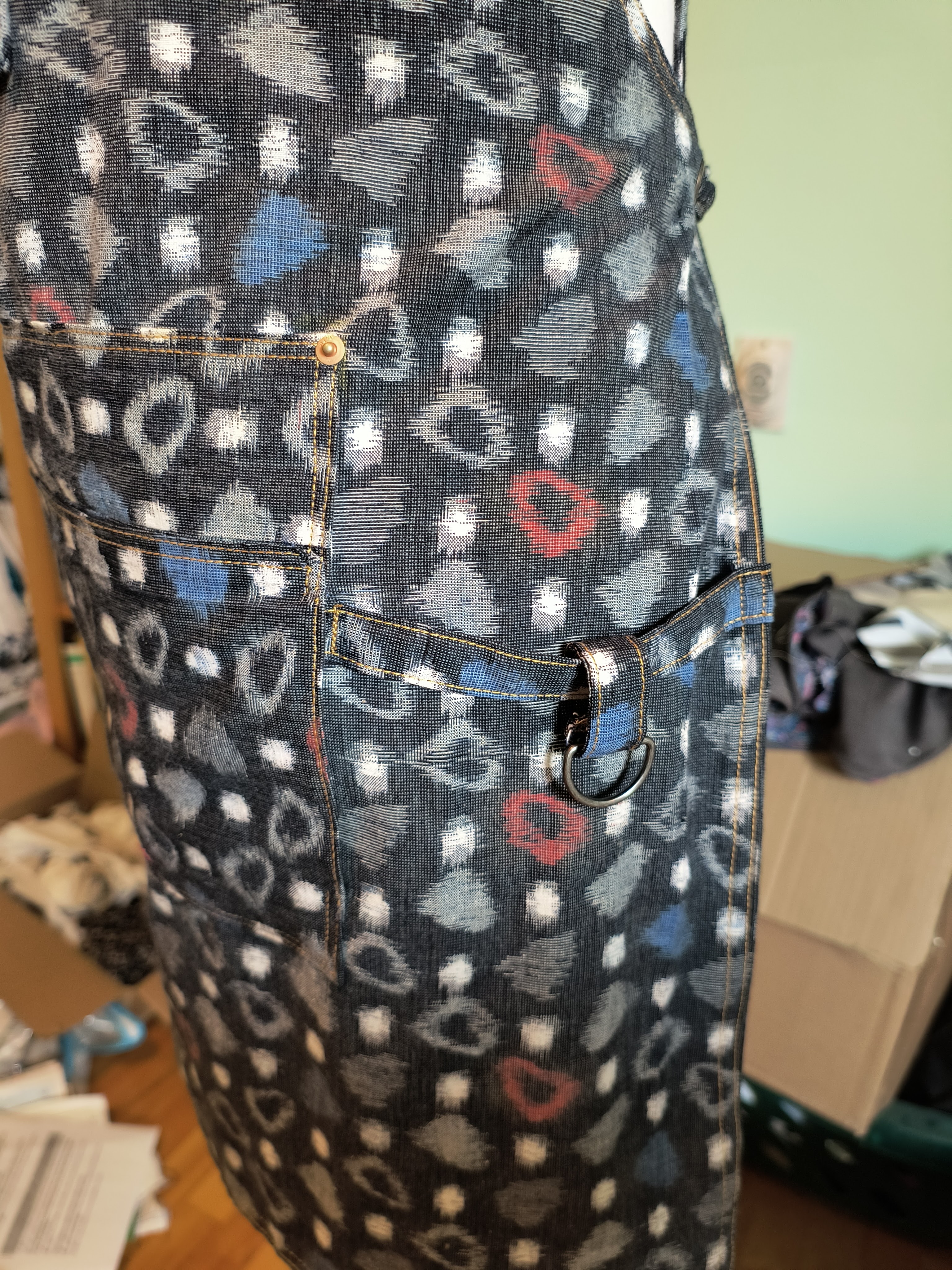 I used an old Japanese apron pattern as a basic (made it much shorter and less wide.) I used a Fabricland tutorial for the back strap-holder idea, and just googled aprons to see various models. I made a chest pocket to hold my phone - so it doesn't bang against the counter when I lean in, and I made a strap on which I can carry a tea-towel if needed, and various other pockets just because! I used the hook system to attach the straps. I think that will not go through the wash well. OOPS!I self-lined the entire apron to make it more sturdy.