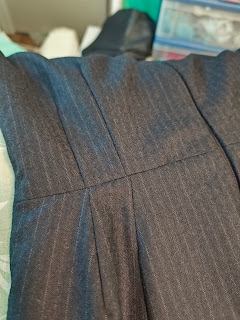 I was in a rush. I did the hem by hand, and it did pucker a bit. I did a nice mitred corner at the vents! (Forgot to get a photo). I then cut down the lining, folded it up and pinned it. I sewed it by hand to the hem, and it puckered some more. And I had trouble arranging the lining vent so that it did not intefere with the back vent itself.